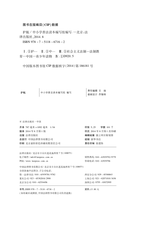 《护航》是一本专为初中生编写的普法读本,由中小学普法读本编写组精心打造,法律出版社出版。本书立足青少年认知特点,以生动案例导入法律知识,辅以插图、法条链接和实用小贴士,深入浅出地讲解中小学生应知应会的法律常识。内容贴近校园生活,涵盖权利保护、行为规范、安全防范等实际问题,帮助青少年从小树立法治观念,养成学法、懂法、守法、用法的良好习惯。作为常熟市青少年法治教育“四落实”工程的重要成果,本书是法治进校园的实用教材,也是青少年法治启蒙的贴心指南。适合教师教学参考与学生自主阅读。