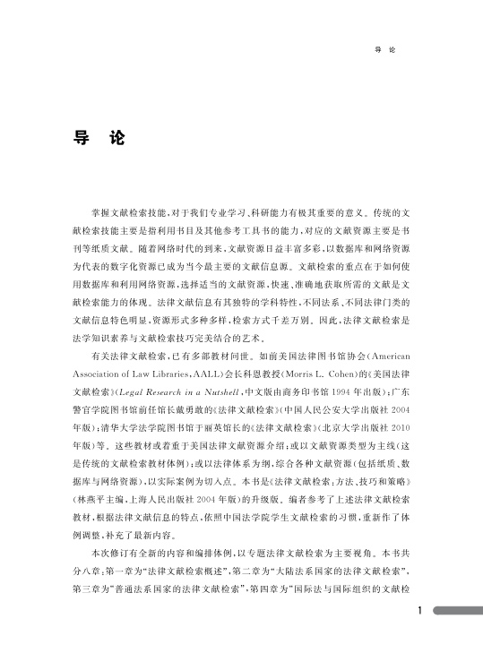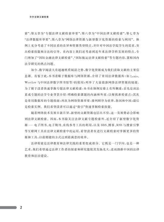 本书全面系统地介绍了中外法律文献检索的核心方法与实用技巧,立足中国法学院学生的学习习惯,融合大陆法系与普通法系的文献特点,涵盖国际法、国际组织及专题领域(如国际金融法、航运法)的检索路径。内容以专题视角展开,从法学背景到数据库指南,从网络资源链接到实际检索案例,层层递进,注重实操。书中详述了Lexis、Westlaw、中国法律数字图书馆等主流数据库的使用,并纳入电子书、博客、RSS、搜索引擎等新型数字化工具在法律检索中的应用,紧贴法学研究热点与技术发展趋势。是法学学习、科研与实务中不可或缺的检索指南。