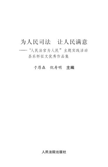 本书由人民法院出版社出版,于厚森、倪寿明主编,汇集了全国法院系统“人民法官为人民”主题实践活动的优秀征文成果。书中通过真实案例与深入思考,生动展现了基层法官践行司法为民宗旨的精神风貌,系统阐释了“党的事业至上、人民利益至上、宪法法律至上”的指导思想。内容不仅涵盖司法理念的理论探讨,也包含提升司法能力、改进工作作风的实践经验,是了解当代中国司法精神与法院文化建设的重要读本。适合法律从业者、司法研究者及关注法治建设的读者阅读。