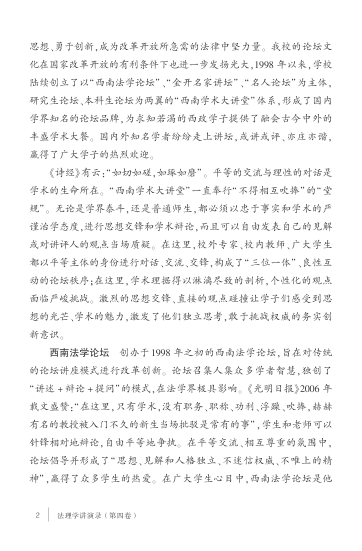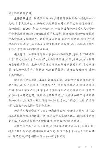 本书是‘西南学术大讲堂’系列丛书的重要组成部分,汇集了西南政法大学多年来的高水平学术讲演精华。以“讲述+辩论+提问”的创新模式,呈现法学界思想碰撞的真实现场。从法理探讨到跨学科视野,从学术争鸣到法治担当,书中不仅记录了专家学者的深度思考,也展现了西政学子不迷信权威、勇于质疑的学术精神。作为中国法学教育重镇的学术缩影,本书是对改革开放三十年法治进程的一份诚挚献礼,适合法理学研究者、法律专业师生及关心中国法治发展的读者深入品读。