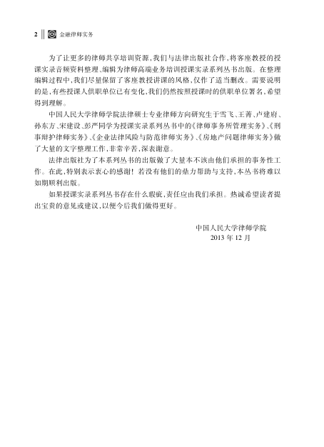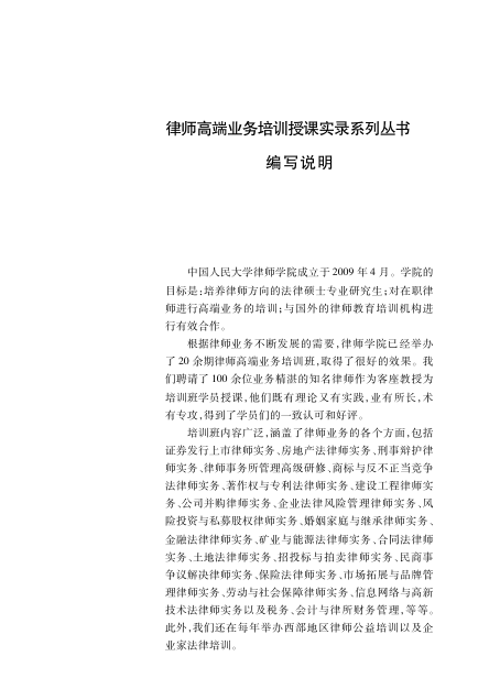 本书源自中国人民大学律师学院高端律师培训课程的授课实录,聚焦金融法律领域的实务操作。内容由一线知名律师亲身讲授,涵盖金融律师日常工作中的核心议题,兼具理论深度与实践指导价值。作为“律师高端业务培训授课实录系列丛书”之一,本书保留了授课语言的生动性与逻辑脉络,适合在职律师、法务人员及法律专业学生阅读学习。通过真实案例与实务经验的分享,帮助读者快速掌握金融法律服务的关键技能。资源珍贵,值得收藏。