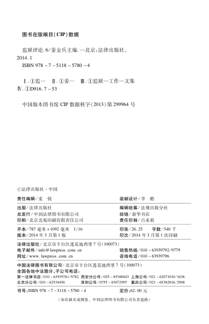 《监狱评论.6》由姜金兵主编,法律出版社2014年出版,是一部聚焦监狱制度、管理实践与队伍建设的专题文集。本书收录多篇实务研究与理论探讨文章,内容涵盖监狱工作的政策解读、队伍建设、管理模式创新等方面,具有较强的学术价值与实践参考意义。作为《监狱评论》系列出版物的第六辑,延续了该系列关注刑罚执行前沿问题的一贯风格,适合法学研究者、司法实务工作者及刑事政策关注者阅读参考。