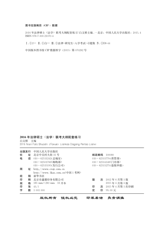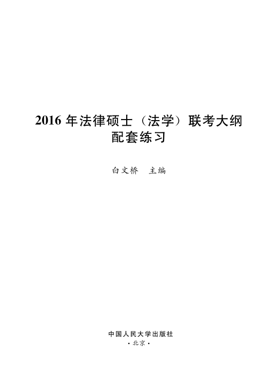 本书由白文桥主编,中国人民大学出版社出版,是针对2016年法律硕士(法学)联考大纲的配套练习用书。全书紧扣最新考试大纲,系统覆盖刑法学、民法学、法理学等核心科目,结构清晰,题型全面,兼具基础训练与考点强化功能。作为法硕备考的经典辅助资料,本书不仅有助于巩固知识点,还能有效提升应试能力。适合法学专业考生系统复习与查漏补缺,是备战法律硕士联考的实用工具书。