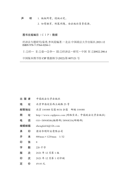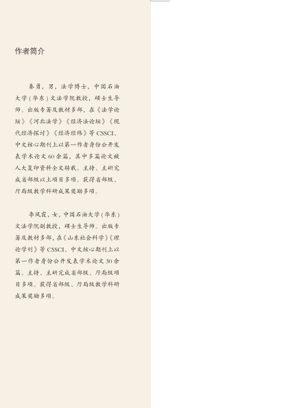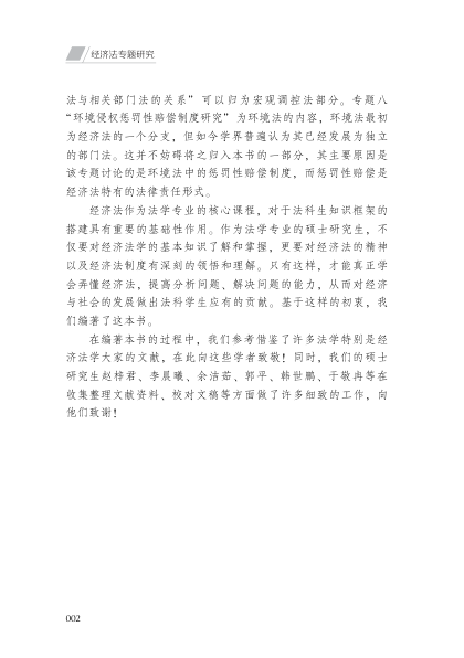 本书由秦勇、李风霞编著,立足中国法治实践,围绕经济法领域的关键议题展开深入探讨。内容涵盖宏观调控法、市场规制法及新兴的环境侵权惩罚性赔偿制度等专题,既体现经济法的传统框架,又回应现实法律挑战。作者团队来自中国石油大学(华东)文法学院,具有深厚的学术积累,书中融合多年研究成果与教学经验,适合作为法学研究生及实务工作者的参考用书。尽管部分专题涉及环境法等交叉领域,但始终紧扣经济法的责任机制与制度逻辑,展现出较强的理论深度与问题意识。
