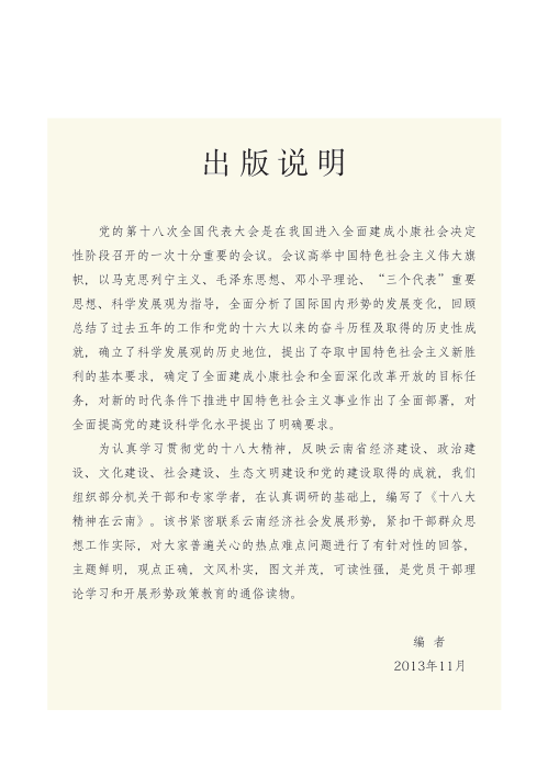 本书由中共云南省委宣传部组织编写,系统阐释党的十八大精神在云南的贯彻落实与实践成果。内容紧密结合云南省情,围绕经济、政治、文化、社会、生态文明建设和党的建设六大方面,全面展现云南在新时代背景下的发展路径与政策回应。全书立足干部群众关心的热点问题,以通俗易懂的语言、图文并茂的形式,深入浅出地解读十八大提出的战略部署,兼具理论深度与可读性,是了解地方如何落实中央精神的重要参考读物。