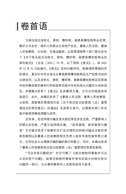 本期《刑事法律文件解读》总第204辑由人民法院出版社权威编纂,聚焦刑事司法实践热点与难点。重点收录最高人民法院、最高人民检察院、公安部等十部门联合发布的《关于依法惩治涉枪支、弹药、爆炸物、易燃易爆危险物品犯罪的意见》及其权威解读,回应行刑衔接与法律适用难题。同时收录《依法惩治妨害国(边)境管理违法犯罪的意见》及答记者问,强化执法司法协同。典型案例部分涵盖检察机关打击电信网络诈骗及关联犯罪、妨害国(边)境管理犯罪的指导案例,兼具实务参考与警示教育意义。另刊载《高空抛物刑事案件司法认定的若干问题》研究文章,深入剖析审判难点。是刑事司法工作者、法律研究者不可或缺的实务参考。