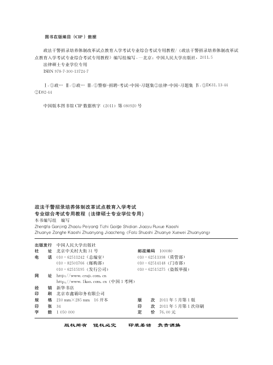 本书由权威编写组联合中国人民大学出版社推出,专为政法干警招录培养体制改革试点考试设计,适用于法律硕士专业学位考生。内容紧扣2011年考试大纲,涵盖专科、本科、硕士各层次考点,系统梳理法律基础、综合知识与实务应用,兼具讲解与练习功能。全书知识覆盖全面,题型解析透彻,配套模拟试卷帮助考生熟悉考试节奏,实现‘学、考、用’一体化。适合零基础或多年未参考的考生系统复习与冲刺备考,是一站式备考的优选资料。