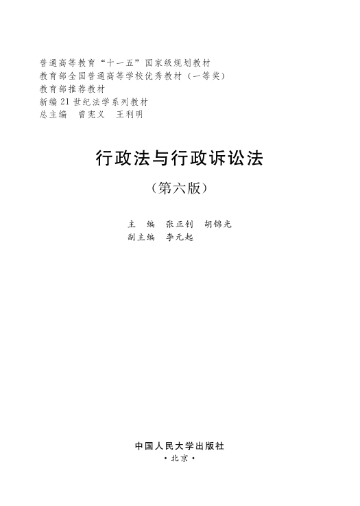 本书为《行政法与行政诉讼法》第六版,属“新编21世纪法学系列教材”之一,入选普通高等教育“十一五”国家级规划教材,并荣获教育部优秀教材一等奖。由张正钊、胡锦光主编,中国人民大学出版社出版,体系完整、逻辑严谨,广泛应用于高校法学教学,是行政法领域的重要基础教材。