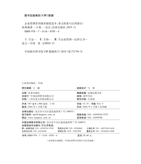 本书由孙林编著,法律出版社2016年出版,是一本面向企业管理人员与法务工作者的实用工具书。全书围绕企业日常管理中的核心制度需求,系统收录了公司章程、股东会、董事会、监事会等基本管理制度范本,并涵盖合同管理、财务管理等关键领域的规范文本。内容条理清晰,兼具法律依据与实操指引,便于企业快速查阅与定制使用。适合企业法务、HR、管理者及法律从业者作为案头参考。第二版更新了相关法规衔接,提升适用性,是构建企业制度体系的可靠助手。