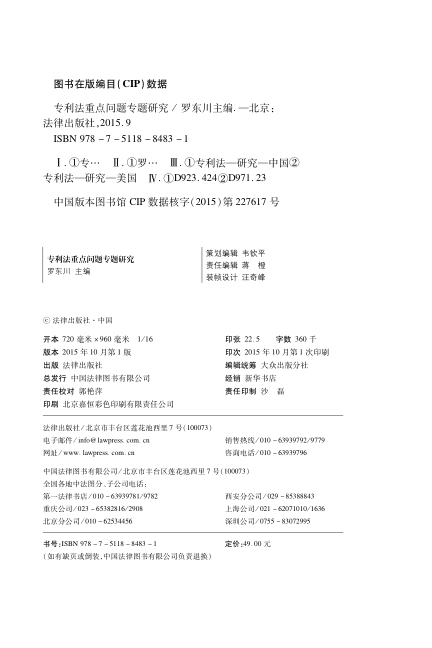 本书由罗东川主编,法律出版社2015年出版,聚焦中国与美国专利法领域的重点与前沿问题,立足于创新驱动发展战略背景,深入探讨专利制度在激励技术创新中的关键作用。内容以问题为导向,涵盖专利法理论与实践中的热点议题,兼具比较法视野与现实关切。尽管各专题独立成篇、体例不拘,但整体紧扣专利制度如何服务科技创新与经济发展方式转型,适合法学研究者、知识产权从业者及政策制定者参考。本书为理解我国专利法演进与制度设计提供了扎实的学术基础。