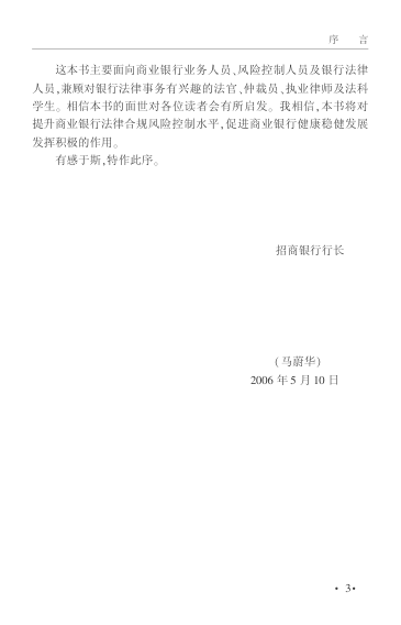主编朱黎明具有丰富的金融法律管理与仲裁经验,序言由时任招商银行行长马蔚华亲笔撰写,强调依法合规经营对银行可持续发展的重要意义。本书不仅是一线银行法律与合规人员的实用参考,也适合法官、律师、法务从业者及法科学生深入了解商业银行法律实务的前沿动态。内容紧扣2006年金融开放背景,是理解当时银行法律风险应对逻辑的重要资料。