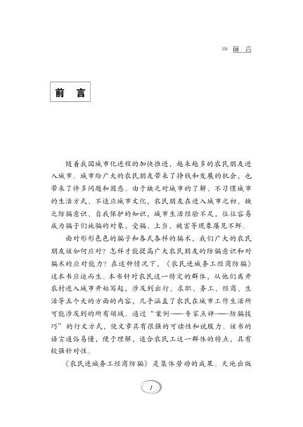 随着城市化进程加快,越来越多农民朋友走进城市寻求发展机会,但因缺乏城市生活经验,常常成为骗子的目标。本书《农民进城务工经商防骗》专为农民工群体量身打造,涵盖出行、求职、务工、经商、日常生活五大方面,通过真实案例、专家点评与实用防骗技巧相结合的方式,帮助读者识别常见骗局,提升自我保护能力。语言通俗易懂,结构清晰,极具针对性和可读性。无论是初入城市的务工者还是计划经商的农民朋友,都能从中获得切实有效的指导,是一本不可多得的实用手册。