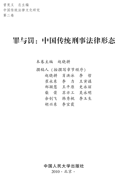 本书是中国传统法律文化研究系列的第二卷,由赵晓耕主编,中国人民大学出版社出版。全书以“罪”与“罚”为核心线索,系统梳理了中国古代刑事法律观念的起源与发展,深入剖析了定罪与科刑的制度逻辑与文化背景。作为曾宪义总主编的重要学术成果之一,本书汇聚多位法律史学者的合力撰写,内容涵盖从思想观念到司法实践的多重维度,既有理论深度,又具史料厚度。适合对中国法律史、传统法文化及刑事司法制度演变感兴趣的读者阅读与研究。