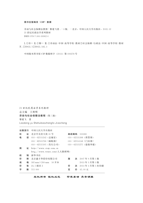 本书是‘21世纪民商法学系列教材’的重要组成部分,由中国人民大学黎建飞教授撰写,第三版结合最新立法动态全面更新。内容涵盖劳动法基本原则、劳动合同、工作时间、工资保障、社会保险及劳动争议处理等核心议题,体系完整、逻辑清晰,兼具理论深度与实务指导价值。作为高校法学教材,本书适合法学专业师生及法律实务工作者系统学习使用,是理解中国劳动与社会保障法律制度的权威读本。