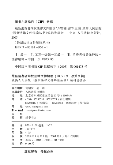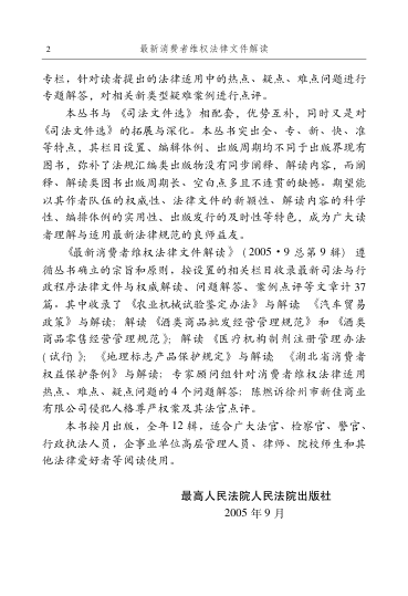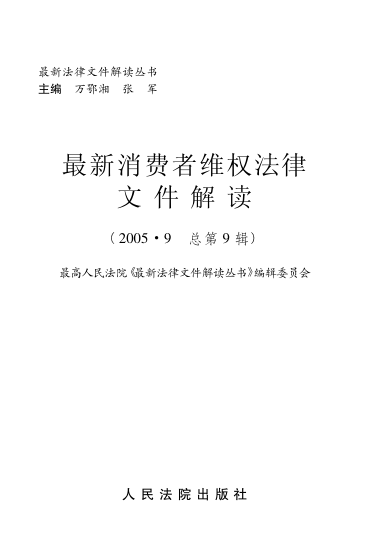 本书为《最新法律文件解读丛书》2005年9月第9辑,由最高人民法院《最新法律文件解读丛书》编辑委员会编撰,万鄂湘、张军主编,人民法院出版社出版。聚焦消费者权益保护领域的最新法律文件与司法实践,收录《农业机械试验鉴定办法》《汽车贸易政策》《酒类商品经营管理规范》《医疗机构制剂注册管理办法》《地理标志产品保护规定》等法规的权威解读,并对《湖北省消费者权益保护条例》进行深入分析。书中还包含专家针对法律适用热点问题的解答及典型维权案例点评,如陈燃诉徐州新佳公司侵犯人格尊严权案,兼具实务指导性与理论参考价值。适合法官、检察官、律师、行政执法人员及法学院师生阅读,是理解2005年消费者维权法律动态的重要参考资料。