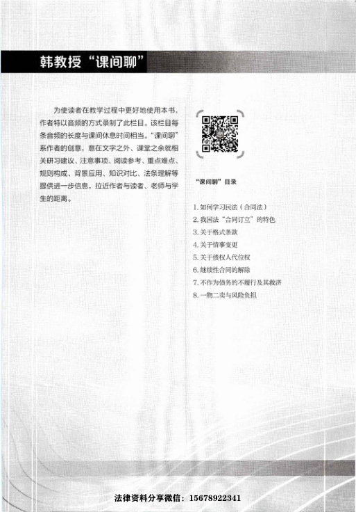 书中不仅系统阐述合同法基本原理,还深入探讨格式条款、情事变更、债权人代位权、继续性合同解除等难点问题,并附有“课间聊”音频栏目,提供学习建议、重点解析与法条理解指引,极大增强可读性与教学互动性。适合法学专业师生、法律实务工作者及备考人士阅读使用。