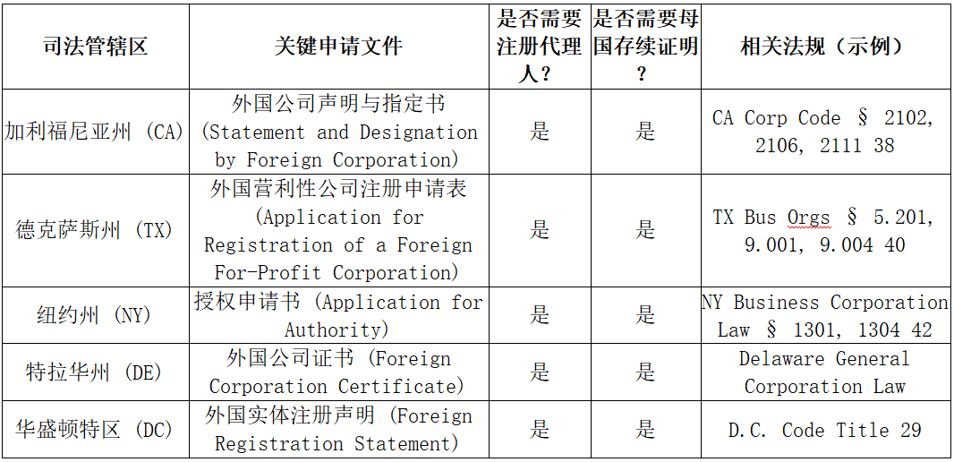 下表总结了在五个特定司法管辖区为外国(非美国)公司办理资格认证的关键要求。
