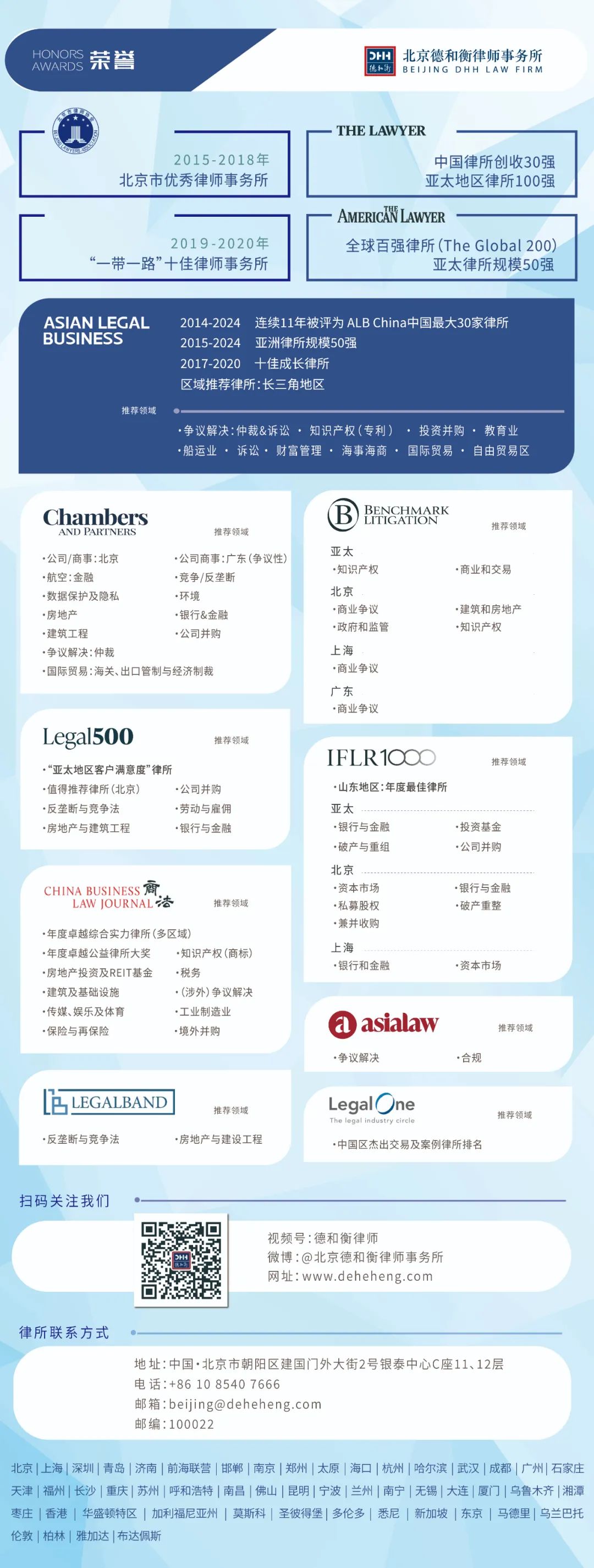 个人荣誉: 连续4年荣膺英国《钱伯斯全球指南》(Chambers Global)《钱伯斯大中华区法律指南》(Chambers Greater China Region)航空:金融领域领先律师;荣获《商法》The A-List 法律精英2024-25:律界精锐(中国);入选英国权威法律媒体 Corporate INTL 杂志年度评奖《2023年度名人录》(2023 Who’s Who Adviser Handbook);牵头律所航空法律服务专业,荣膺2022年度《商法》(China Business Law Awards 2022)卓越律所大奖