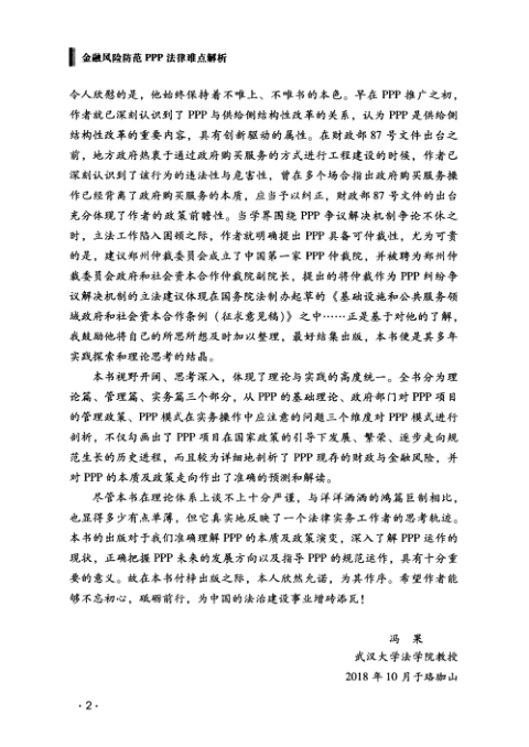 本书由PPP领域资深实务专家李贵修律师撰写,立足于多年一线法律服务与政策研究经验,系统解析政府和社会资本合作(PPP)模式在实践中的法律难点与金融风险。全书分为理论篇、管理篇与实务篇,涵盖PPP基础理论、政策演变、项目操作要点及争议解决机制,尤其聚焦地方政府隐性债务、违规融资等热点问题,前瞻性地探讨了PPP的本源回归与规范发展路径。