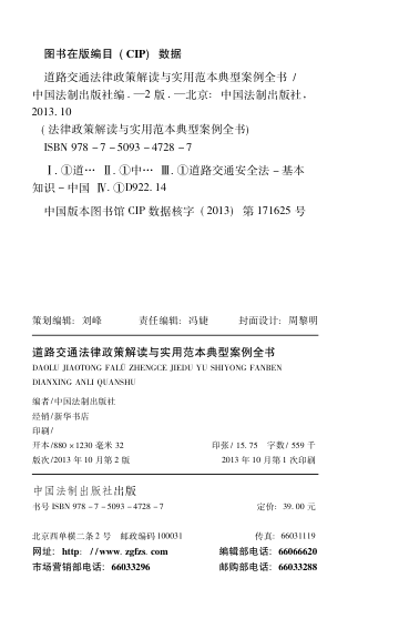 本书由权威法律出版机构中国法制出版社精心编撰,系统整合道路交通领域的法律法规、政策解读、实用文书范本及典型司法案例,全面覆盖日常交通法律纠纷的各类场景。内容结构清晰,分为法律政策解读、文书范本、典型案例与流程图解等多个模块,兼具专业性与实用性。特别适合普通公众、法律从业者及交通管理人员查阅使用。通过权威条文解读与真实判例分析,帮助读者准确理解法律适用,高效应对交通事故处理、责任认定、保险理赔等实际问题。是案头常备、随查随用的法律工具书。