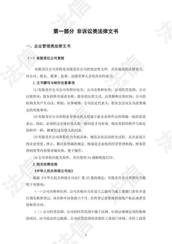 本书为‘法信系列电子书’之一,聚焦法律实务中的非诉讼文书撰写,首部分详述企业设立核心文件——有限责任公司章程的规范制作要点。内容涵盖章程必备条款、制定与修改程序、实操注意事项,并结合《中华人民共和国公司法》第25条逐项解析,兼具指导性与权威性。文本结构清晰,适合作为企业法务、律师及创业者日常参考工具书。虽内容片段有限,但已展现全书立足实务、紧扣法规的编写风格。
