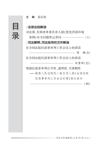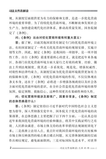 本书由人民法院出版社出版,聚焦2020年初优化营商环境法治进程的关键议题。围绕国务院《优化营商环境条例》的出台背景与制度创新,收录司法部、发展改革委负责人权威答问,系统阐释立法意义、总体思路及对市场主体平等保护、政务服务提升的具体规范。同时,辑录最高人民法院周强、刘贵祥等领导在全国法院民商事审判工作会议上的重要讲话,深入解读《九民纪要》核心精神,增强审判工作的公开性与可预期性。内容兼具政策高度与实务指导价值,是法官、律师、企业法务及研究者把握营商环境法治化、规范化进程的重要参考。