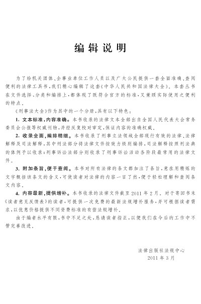 本书是法律出版社法规中心精心编纂的《中华人民共和国刑事法大全》,作为专业法律工具书系列的重要分册,内容全面、权威可靠。全书收录截至2011年2月刑事领域现行有效的法律、法律解释及司法解释,文本源自全国人大常委会公报等官方渠道,确保准确无误。