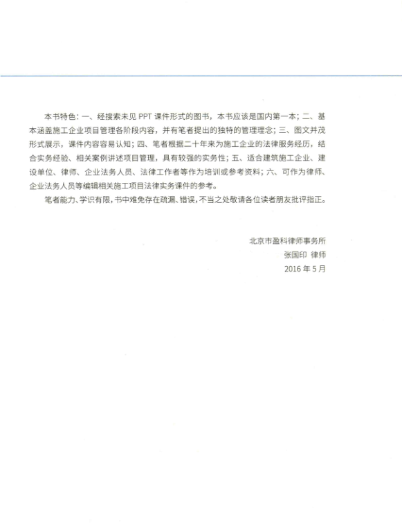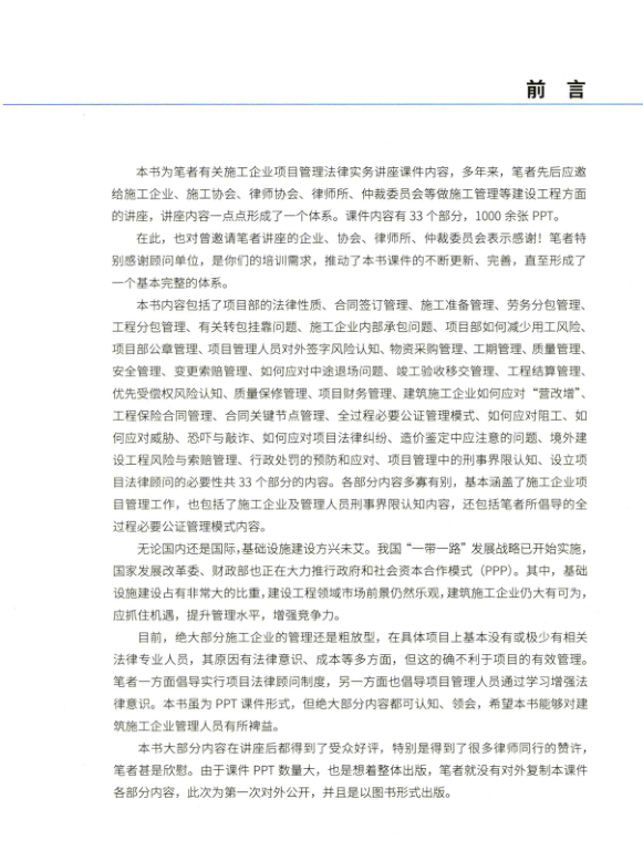 本书源自作者张国印律师多年为施工企业、行业协会及律师群体讲授的法律实务课程PPT,首次以图书形式完整公开。全书共33个专题,涵盖项目部法律性质、合同管理、分包转包、劳务风险、公章管理、工期质量、竣工结算、优先受偿权、刑事界限及境外工程索赔等关键环节,内容系统且高度实务化。