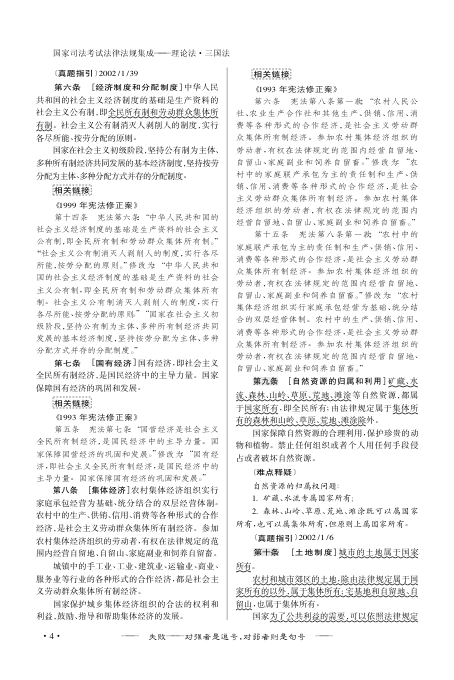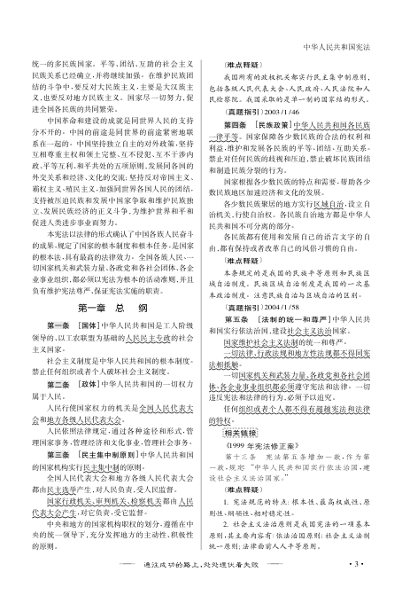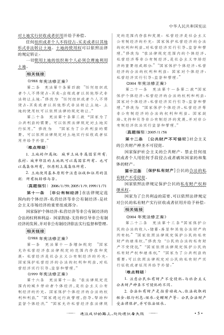 书中不仅收录了《中华人民共和国宪法》全文及其历次修正案(1988、1993、1999、2004),还通过【难点释疑】【真题指引】等模块,帮助考生理解条文背后的法理逻辑与考试重点。例如对“依法治国”“民族区域自治”“土地制度”“非公有制经济地位”“私有财产保护”等高频考点进行了精准标注与解析,极具应试指导价值。
