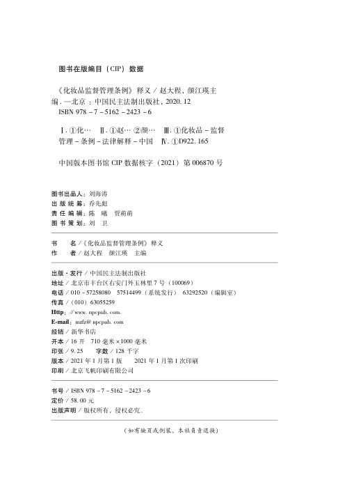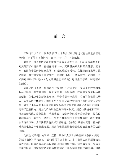 本书由司法部原副部长赵大程与国家药监局副局长颜江瑛联合主编,是国务院《化妆品监督管理条例》的官方配套释义。全书立足立法背景与实践需求,逐条解析2021年施行的新规核心条款,涵盖原料管理、生产规范、注册备案、上市后监管及法律责任等关键内容。作为权威法律解读,本书不仅阐明条文含义,更揭示制度设计背后的监管逻辑,兼具专业性与可读性,适合监管人员、化妆品企业从业者、法律合规人士及研究者参考使用。是理解和适用我国化妆品最新监管体系的重要工具书。