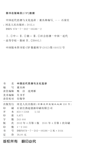 本书由董丛林编写,河北人民出版社出版,是一本面向高校学生的中国近代社会思潮与文化研究教材。全书分为上、中、下三编及附编,以上编为主线,梳理了从经世致用、开眼看世界到新文化运动等进步思潮的发展轨迹,展现晚清至民初思想演变的‘纵向’脉络;中编聚焦教育救国、实业救国、科学救国等专项思潮,体现时代知识分子的救亡探索;下编则转向文化领域,概要介绍近代教育、学术与宗教状况,拓展历史理解的广度。附编精选相关文献资料,便于读者延伸阅读。结构清晰,兼顾深度与可读性,是了解中国近代思想史的良好入门读物。