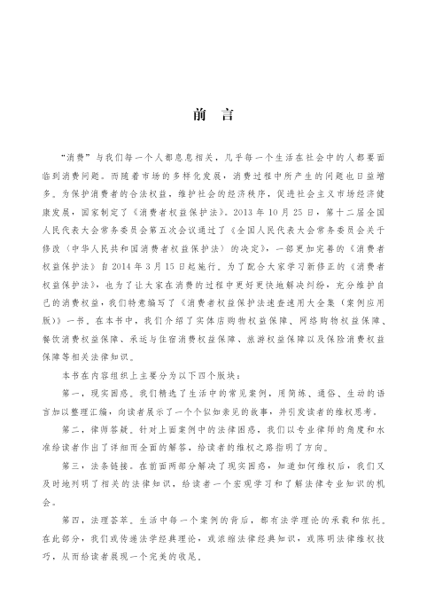 本书是一本专为普通消费者打造的维权指南,紧扣2014年施行的新《消费者权益保护法》,结合真实生活场景,通过“现实困惑 + 律师答疑 + 法条链接 + 法理茶萃”四大模块,系统解析消费维权中的常见问题。涵盖实体店购物、网络消费、餐饮住宿、旅游保险等多个高频领域,案例生动,解答专业,语言通俗易懂。特别设计“小问题目录”和分类检索体系,实现“速查速用”,帮助读者快速定位法律依据,高效解决纠纷。无论是日常消费还是遇到侵权困扰,这本书都能成为你身边的法律助手。