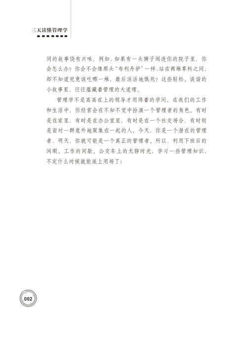 这是一本写给忙碌现代人的管理学“轻读本”。不同于晦涩的教材或高深的学术著作,本书以通俗易懂的语言和生动有趣的故事,带你快速理解管理的本质——管人先管己。从自我管理到团队领导,从决策执行到危机应对,作者磨剑像一位贴心向导,用300多页的篇幅串起管理学中的“美丽贝壳”。书中不乏实用建议:偶尔出点丑拉近距离、克制求胜欲赢得尊重……读来轻松却不失深度。无论你是初带团队的新手管理者,还是希望提升组织能力的职场人,都能从中获得启发。利用通勤或碎片时间翻阅,让管理智慧悄然融入日常。