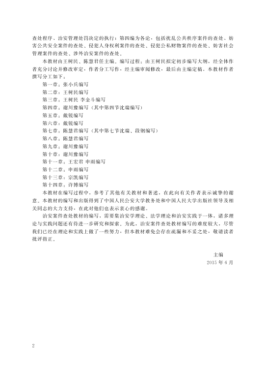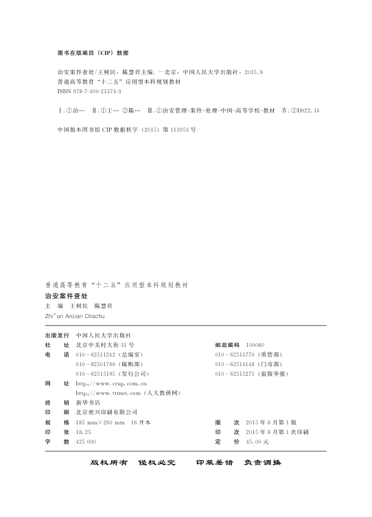 本书是普通高等教育“十二五”应用型本科规划教材,由王树民、陈慧君主编,中国人民大学出版社出版。全书以我国最新治安管理法律规范为依据,结合行政法学理论与执法实践,系统构建了治安案件查处的完整知识体系。内容涵盖导论、证据论、程序论与各论四大部分,深入剖析各类典型治安案件的查处要点,突出证据运用与程序合法性的实务要求。教材立足公安院校教学需求,兼顾理论深度与实践应用,适合治安学专业师生及一线执法人员参考学习。结构清晰、案例贴近现实,是理解中国治安案件处理机制的重要读本。