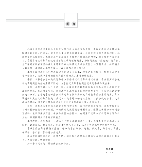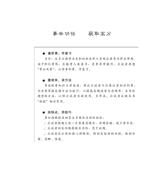 本书由李如海主编、高增霞编著,中国人民大学出版社出版,是针对公务员录用考试中申论科目的系统性辅导用书。书中立足历年真题,全面梳理中央与地方申论题型的演变趋势,结构清晰分为基础认知、题型解析与热点预测三大部分,兼具系统性与实战性。尤为可贵的是,本书首次深入讲解如何高效分析给定材料,并结合最新真题进行多维度解析,涵盖解题思路、答卷示例与评分评析,帮助考生掌握‘以不变应万变’的写作策略。多位一线教师参与编写,内容源自多年授课实践与考生反馈,方法实用、针对性强,被广大应试者誉为‘管用的申论宝典’。适合备考各级公务员考试的考生自学与提升。