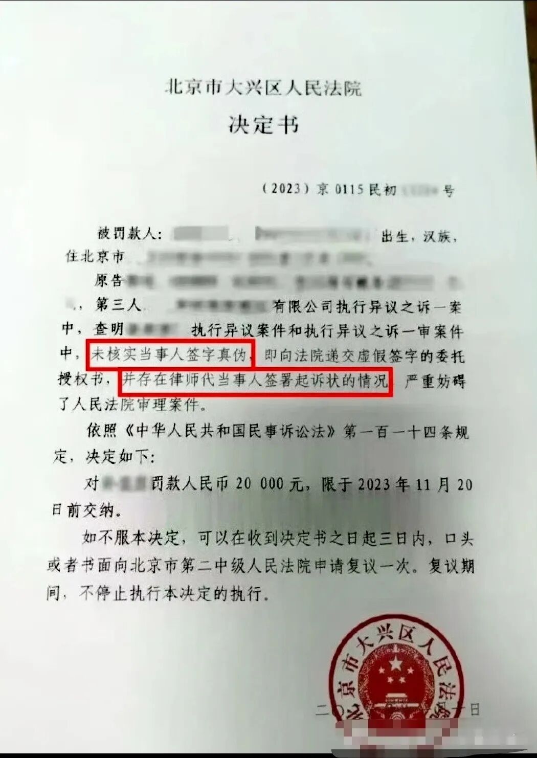 后事情败露,被 大兴法院以“严重妨碍了人民法院审理案件”为由,罚款两万元。
