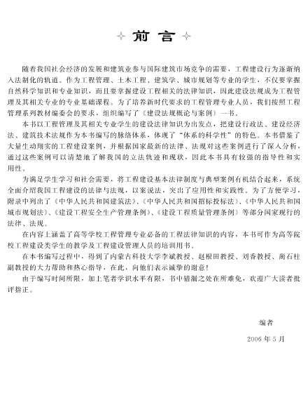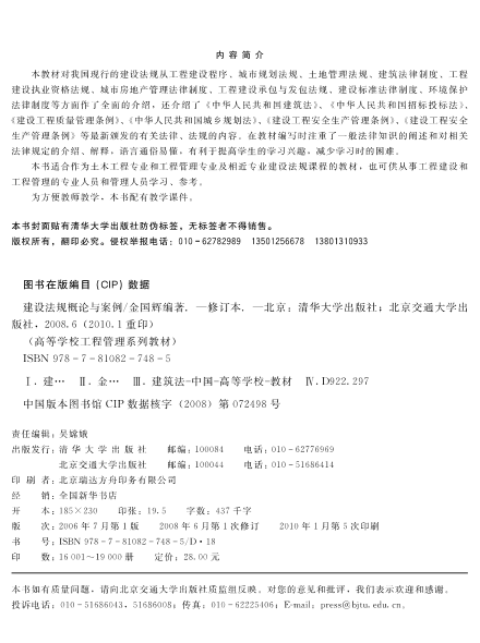 本书系统梳理了我国工程建设领域的核心法律法规,涵盖工程建设程序、城市规划、土地管理、建筑法、房地产管理、承包发包、建设标准及环境保护等多个方面。结合《中华人民共和国建筑法》《招标投标法》《城乡规划法》等最新法规,深入解析立法背景与实践应用。书中融入大量真实案例,以案说法,突出实用性与指导性,帮助读者理解法规在实际工程中的运用。适合作为土木工程、工程管理及相关专业的教学用书,也适合一线工程管理人员参考学习。配套教学课件便于教师授课,是理论与实践结合的优质教材。