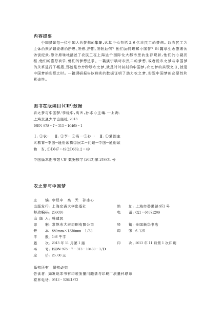 本书聚焦中国农民工群体,通过真实访谈记录、演讲稿与调研报告,深入探讨‘农之梦’与‘中国梦’的内在联系。书中以在沪建设者为样本,原汁原味呈现他们在大都市中的生存现状、情感波动与梦想追求,展现他们对国家发展的理解与期待。主编李经中、高天、孙冰心团队以扎实的田野资料和温情的笔触,揭示农民工不仅是城市发展的参与者,更是中国梦不可或缺的书写者。一本了解当代中国社会现实与底层精神世界的真诚之作。