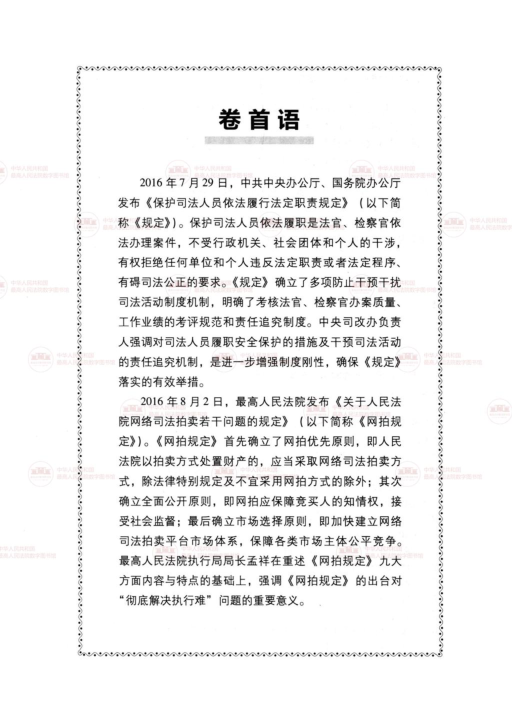 本期《行政与执行法律文件解读》聚焦2016年司法改革关键议题,深入解读中共中央办公厅、国务院办公厅发布的《保护司法人员依法履行法定职责规定》,系统阐释保障司法独立、防范干预司法的制度设计。同时,全面解析最高人民法院《关于人民法院网络司法拍卖若干问题的规定》,阐明网拍优先、公开透明与市场选择三大原则,助力破解“执行难”问题。另收录行政检察监督研究及典型动产抵押登记案例评析,理论与实务兼备,是司法实务工作者、行政法研究者不可多得的参考材料。