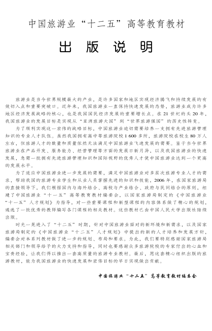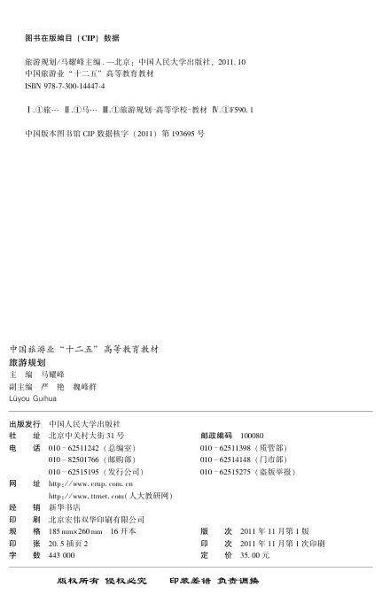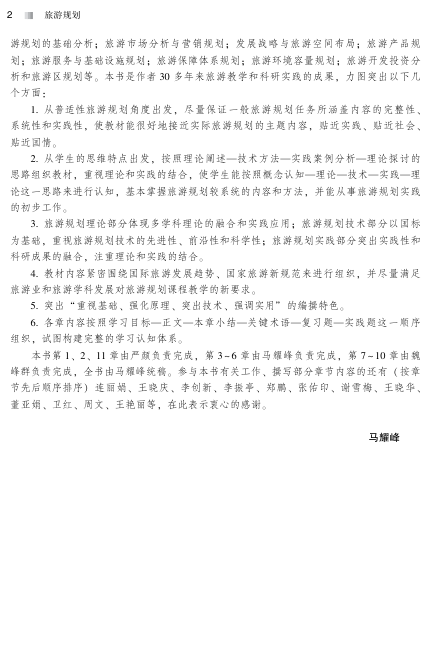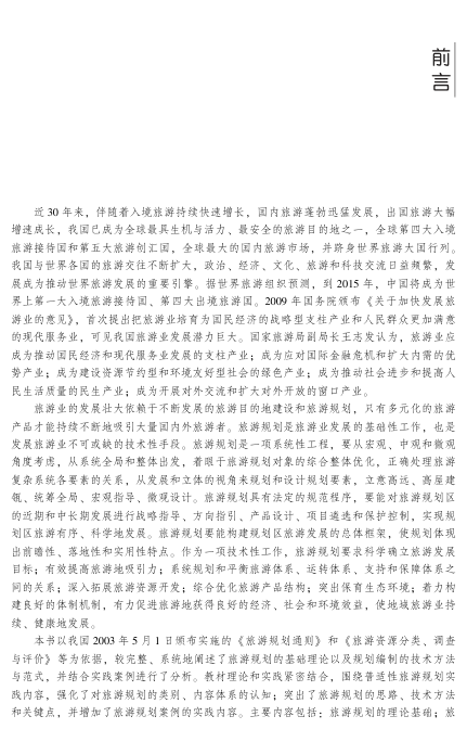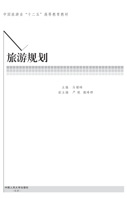 本书由马耀峰主编,作为中国旅游业“十二五”高等教育教材之一,系统整合了旅游规划的基础理论、技术方法与实践案例。以国家《旅游规划通则》和旅游资源评价标准为依据,内容涵盖旅游市场分析、空间布局、产品设计、基础设施规划、环境容量及投资分析等核心模块,结构完整、逻辑清晰。全书注重理论与实践结合,采用“理论—方法—案例—练习”的编写模式,适合高校旅游管理专业教学使用,也对从事旅游规划实务的从业者具有重要参考价值。强调基础性、科学性与实用性,是了解中国旅游规划体系与发展思路的代表性著作。