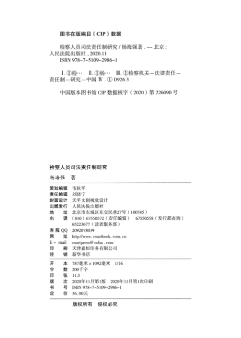 这是一部紧扣中国司法改革核心议题的扎实学术著作。作者杨海强以‘司法责任制’为切口,深入检察权运行一线,不满足于泛泛而谈制度框架,而是着力剖析六个关键维度:中外比较、检法差异、以审判为中心背景、监察体制改革影响、层级差异与地域差异。尤为可贵的是,书中直面当前研究中的‘沉默地带’——如办案组设置模式、检察官考核评鉴机制、监督管理责任的界定、检察官惩戒与监察程序的职责边界等具体而微的制度难题。全书立足实证关切,兼具理论深度与实践温度,是理解新时代检察权规范化、专业化运行不可多得的参考文本。