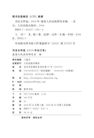 📚 这是一本由最高人民法院研究室权威编纂的年度司法实务工具书——《司法文件选:2006年》。作为2006年合订本,它系统收录了当年生效的重要法律、行政法规、司法解释及规范性文件,尤以2005年全面修订、2006年起施行的《中华人民共和国公司法》为核心内容(全文刊载,含历次修正与修订说明)。全书结构清晰、文本准确,是法官、律师、法务、法学研究者及备考法律职业资格人员查阅原始司法依据的可靠案头资料。开本适中、印刷规范,由人民法院出版社于2006年12月首版首发,兼具时效性与权威性。