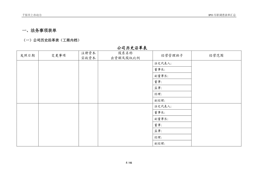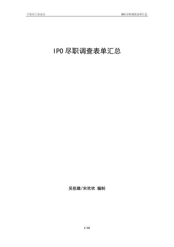 这是一份高度结构化、可直接落地的IPO尽职调查实操手册,由吴祖雄、宋欢欢编制,聚焦A股IPO申报前的核心核查环节。全书按法务与财务两大主线梳理,涵盖公司历史沿革、股东及董监高信息、诉讼与合同档案、生产工艺与销售体系,以及近三年财务数据明细(含成本、毛利率、税收、银行流水、担保、客户/供应商排名等)共60余张标准化表单(含范本与统计模板)。内容务实、字段清晰,特别适合券商投行、会计师事务所、律所及拟上市企业董办、财务、法务人员用于底稿整理、问题清单梳理与内控自查。非理论阐述,而是‘拿来即用’的核查脚手架。