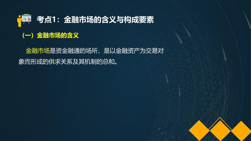 本资料为李瑞老师主讲的中级经济师《金融专业知识与实务》教材精讲班第一章(01-02讲)配套内容,聚焦‘金融市场与金融工具概述’核心模块。开篇即厘清金融市场本质——不仅是资金融通场所,更是以金融资产为交易对象的供求关系及其运行机制的总和,并系统梳理构成要素与分类逻辑。内容紧扣考试大纲,考点标注清晰(如‘考点1:金融市场的含义与构成要素’),语言简练、逻辑分明,适合作为预习导学或重点强化素材。适合备考中级经济师金融科目的考生高效梳理知识框架、夯实基础概念。