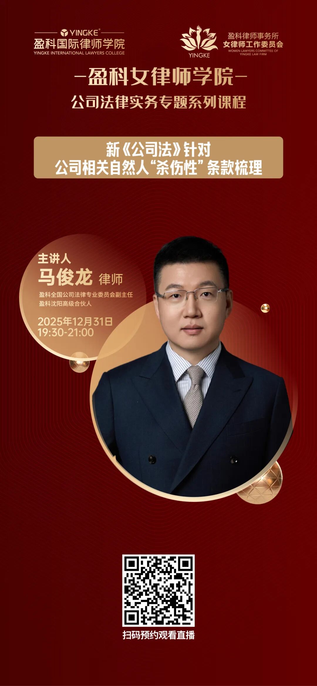 主讲人:马俊龙,盈科全国公司法律专业委员会副主任、盈科沈阳高级合伙人律师