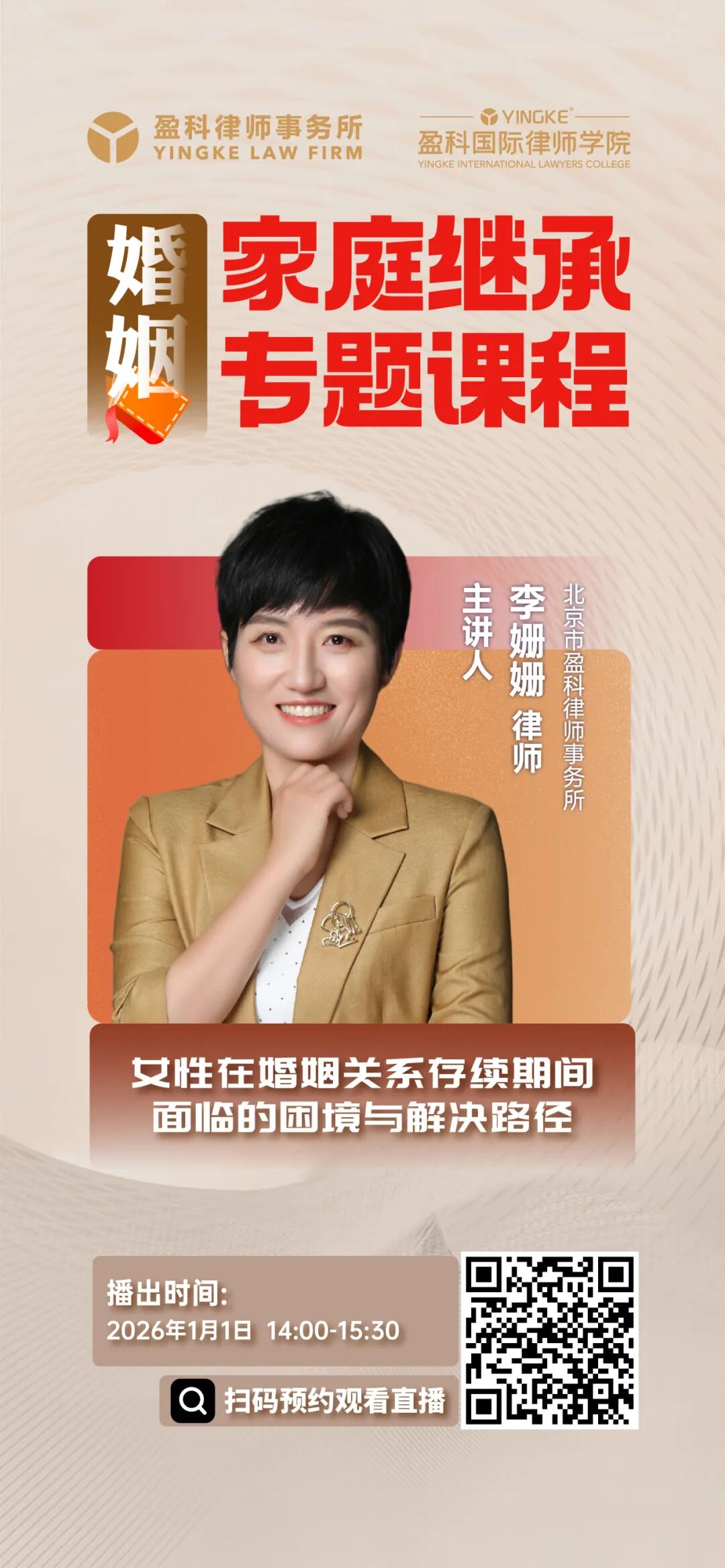 课程简介:女性在家庭中地位举足轻重,在婚姻关系存续期间亦面临着形形色色的问题。如何破解此类难题?本次课程将从婚姻制度的历史演变与女性角色变迁切入,力求在推动男女平等、促进社会和谐中发挥应有的作用。
