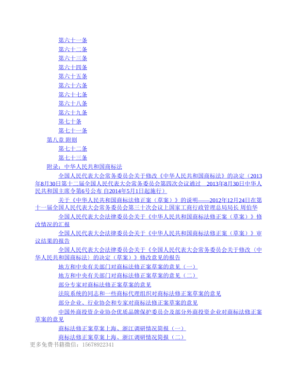 这是一本由中国法制出版社于2013年出版的《中华人民共和国商标法》权威解读读本,由专业编写组编著,紧扣2013年8月全国人大常委会通过的最新修正案(自2014年5月1日起施行)。全书以逐条释义方式深度解析法条,涵盖注册、续展、转让、许可、无效宣告、使用管理及权利保护等完整制度链条,并附有立法说明、审议报告、地方与部门意见、专家及外企反馈等一手资料,兼具实务指导性与立法背景纵深感。适合法律从业者、知识产权代理人、企业法务及备考人员系统掌握商标法修订要点与适用逻辑。