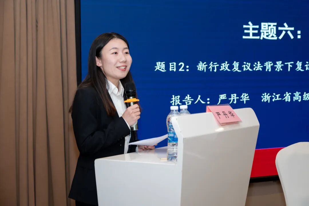 浙江省高级人民法院行政审判庭法官助理严丹华以“新行政复议法背景下复议诉讼衔接的现状考察与完善路径”为题发言。 她从新修订的行政复议法实施首年浙江省行政复议申请量、复议诉讼比、经复议行政诉讼案件占比与类型构成等实践情况出发,肯定了行政复议吸纳行政争议能力显著提升,同时指出当前行政复议作为“分流阀”“过滤器”的实效与新行政复议法的制度构想仍有一定差距。她重点围绕复议前置范围界定分歧、法院对经复议案件的审查监督模式尚不统一、信访事项复议诉讼化等具体问题,分析了当前行政复议与行政诉讼衔接机制的问题堵点,及其导致的程序性案件增多、救济资源分散等后果,并从把好复议入口关、构建优势互补的审查格局、协同推进“当事人一件事”改革、健全配套保障机制等四个角度提出改进路径。