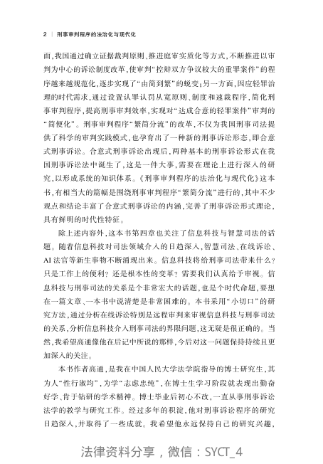 本书是高通博士基于新时代刑事司法改革实践撰写的专题力作,入选‘南开法治文丛’。全书四章紧扣‘提炼中国特色刑事审判理论’主线:第一章与第三章深入探讨庭审实质化路径与死刑复核程序的法治完善;第二章聚焦刑事速裁程序中的证明标准与实践张力;第四章虽未在片段中展开,但据序言可知其延续对程序现代化的系统反思。作者立足十年改革实证,直面学界对审判程序经验总结不足的现状,兼具理论深度与实务关切。法律出版社2024年2月首版,内容严谨、结构清晰,是理解我国刑事审判程序转型不可多得的学术参考。