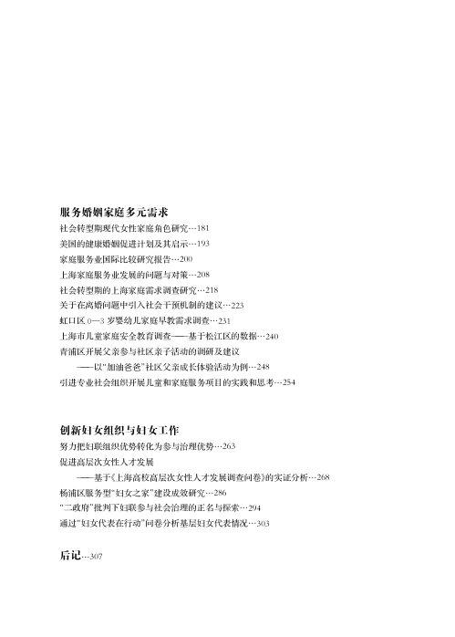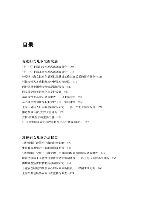 这本由上海市妇联主编的年度研究成果汇编,聚焦2015年前后上海妇女工作前沿议题,涵盖婚姻家庭服务、儿童早期发展、父亲参与、家政服务业转型、高层次女性人才成长、基层妇联治理创新等多元维度。书中既有扎实的实证调查(如松江区家庭安全教育、虹口区0—3岁早教需求、杨浦区‘服务型妇女之家’建设),也有政策比较(如美国健康婚姻促进计划)与机制建议(如离婚社会干预、专业社会组织介入路径)。内容兼具地域性、时效性与方法论意识,是了解当代中国城市妇女工作理论化、专业化进程的重要参考文本。